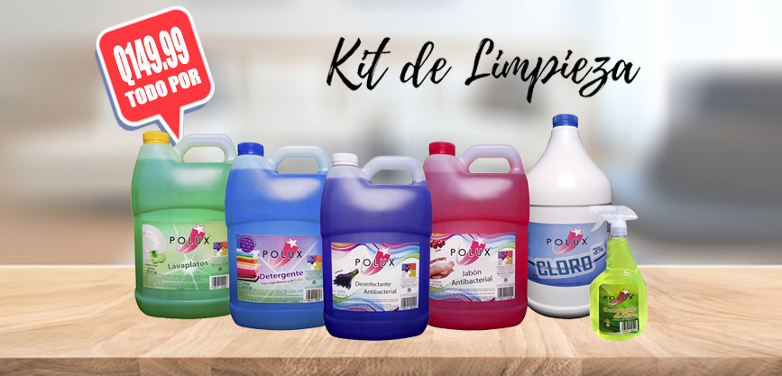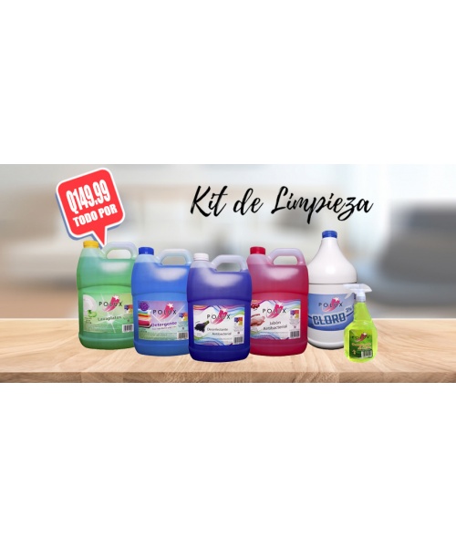 Un kit ideal para su hogar u oficina que incluye: 1 Gal贸n de Desinfectante multiusos 1 Gal贸n de Jab贸n de manos Antibacterial 1 Gal贸n de Detergente para ropa 1 Gal贸n de Lavaplatos l铆quido 1 Gal贸n de Cloro 1 Atomizador Desengrasante de cocina